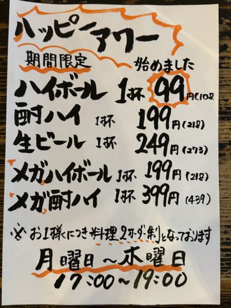 期間限定 月曜日〜木曜日の17:00〜19:00