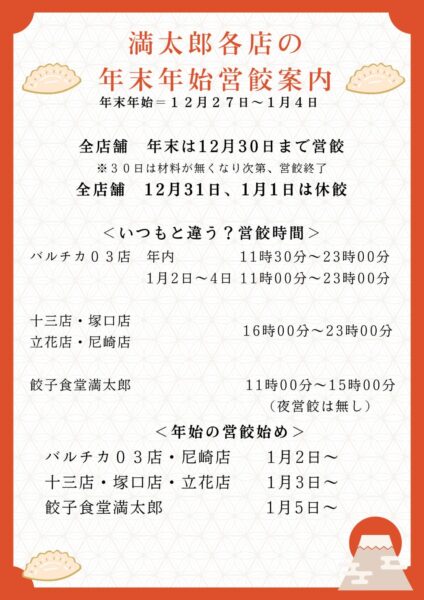 もうすぐ年末ですが、満太郎の営餃日🥟のお知らせです!!