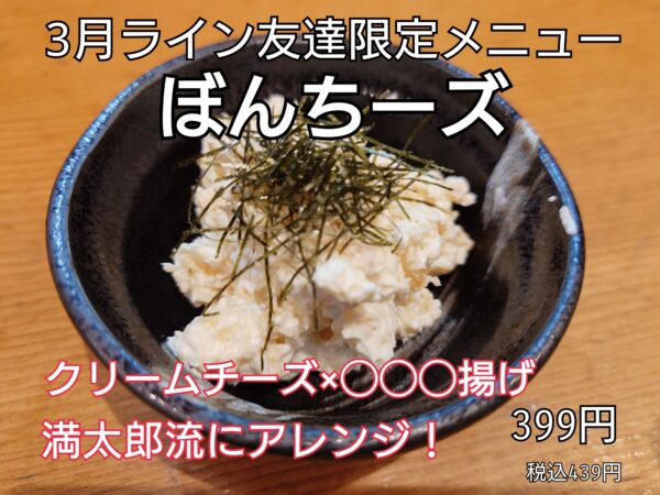3月だけのなんとも満太郎らしい遊び心のあるアテの登場!本日から各店スタートしてます!
