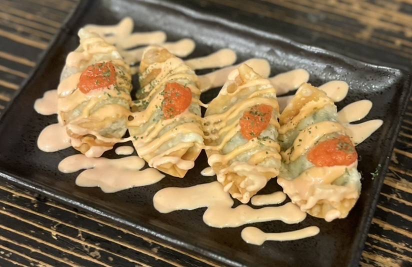 揚げた元祖野菜餃子のトッピングに、赤い明太子、淡いピンクのオーロラソースをかけて、粉パセリをまぶし、目でも春を感じられ、元祖野菜餃子の旨さをより引き立てる仕上がりになっております!
